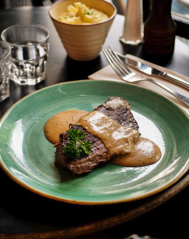 Le steak au poivre à notre façon .. cœur de rumsteack sélectionné par notre boucher et sa sauce au poivre maison… addictive 😍 Sans parler de sa purée de pommes de terre …..😋